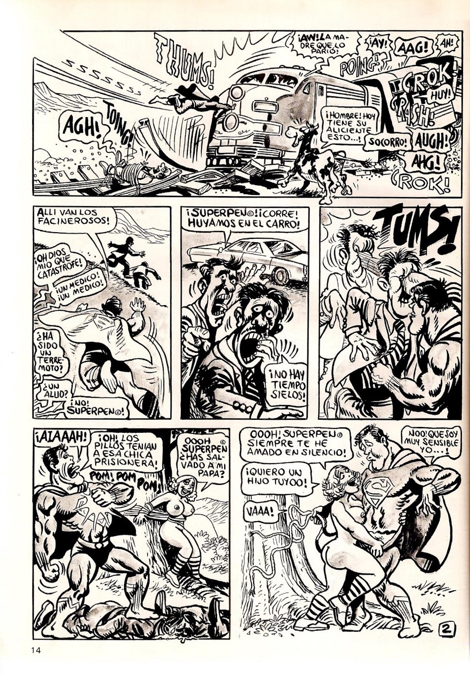 Los primos Ventura & Nieto, Manel, y Tha & Bigart defienden el fuerte historietístico con la ayuda puntillosa de Andreu Martín y Mariel, mas alguna otra supermánica muestra de historieta de una única página (anónima, o al menos sin firma). Sexo muy duro el que revela Manel Ferrer, estatuas, dinosaurios, cualquier cosa que no sea una mujer de carne y hueso sirven a las necesidades del kriptoniano. Diferente es el asunto cuando, y es culpa de Ventura y Nieto, Superman entra en intimidad con otra mujer al trapo de la mayor de sus perfecciones como objeto mercadotécnico; que personifica la bajada de pantalones de un geyperman. —La dupla Tha y Bigart se libró del sexo aliándose al absurdo.—